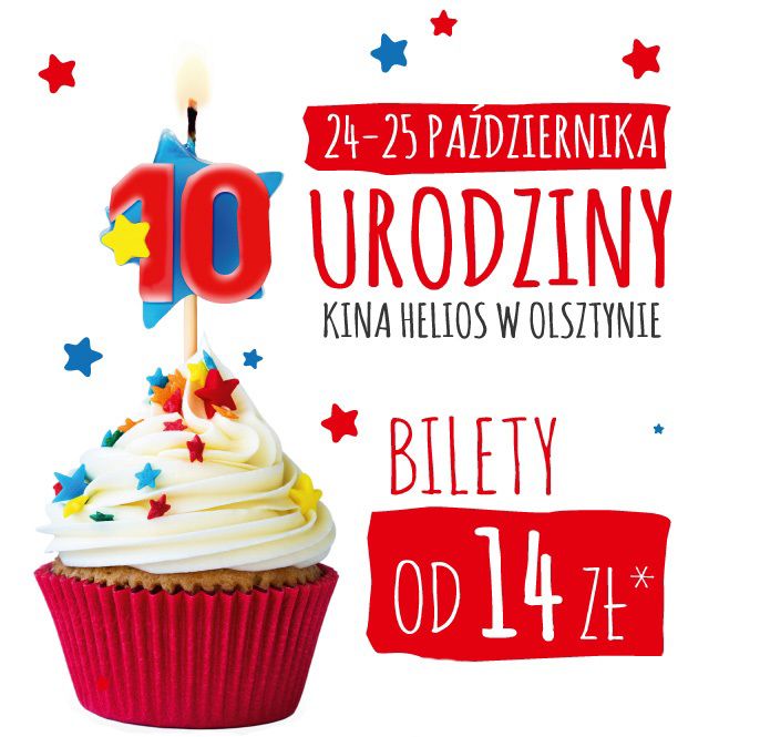 Helios zaprasza Widzów do filmowej zabawy przy okazji dziesięciolecia obecności w Olsztynie! Podczas urodzinowego weekendu odbędą się liczne konkursy z nagrodami przed wybranymi seansami na salach kinowych, animacje na holu kina z Karuzelą Kultury oraz niedzielnej zabawy ze szkółką piłkarską Funfutbol. Wielkie świętowanie zwieńczy uroczyste krojenie tortu – będzie to słodki finał urodzin z poczęstunkiem dla wszystkich Widzów!