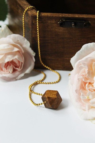 Wyjątkowy minimalistyczny naszyjnik z geometryczną drewnianą zawieszką w kształcie wielościanu w kolorze orzechowego brązu.