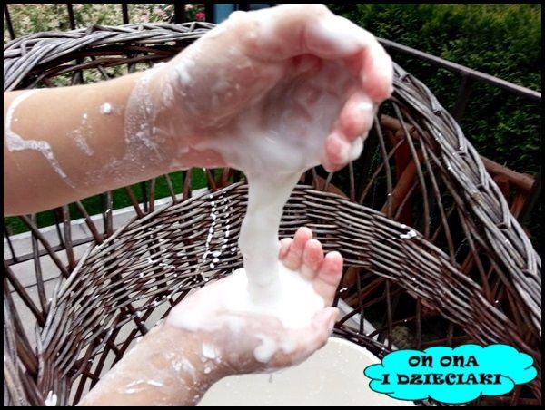 Robiłyśmy kulki lub próbowałyśmy je robić, bo nie zawsze się nam udawało i patrzyłyśmy jak się "roztapiają". Ciecz jest delikatna i bardzo miła w dotyku.