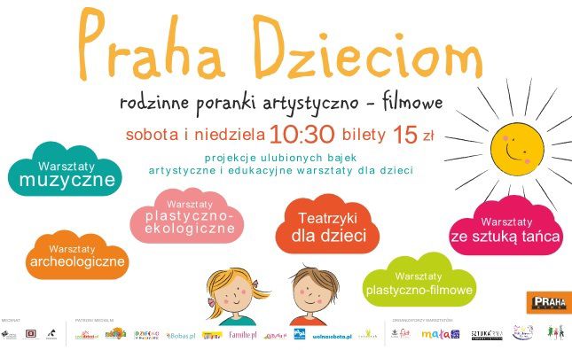„PRAHA DZIECIOM – rodzinne poranki artystyczno - filmowe” to cykl weekendowych spotkań dla dzieci i ich opiekunów. Przed projekcjami baje dzieci są zapraszane na edukacyjne i artystyczne warsztaty. Podczas zajęć dzieci mogą poszerzyć wyobraźnię, rozwinąć kreatywność oraz zdolności plastyczne i manualne. W programie znajdą się warsztaty: muzyczne, plastyczno-ekologiczne i poranki teatralne. W ramach specjalnych seansów filmowych, pokażemy niezapomniane bajki dla dzieci ze Studia Filmów Rysunkowych z Bielsko-Białej. Na dużym ekranie pojawią się ulubione postacie z dobranocek - Koziołek Matołek, Bolek i Lolek, Reksio, Baltazar Gąbka i wiele innych. Zachęcamy rodziców z dziecimi w wieku od 3 do 10 lat.