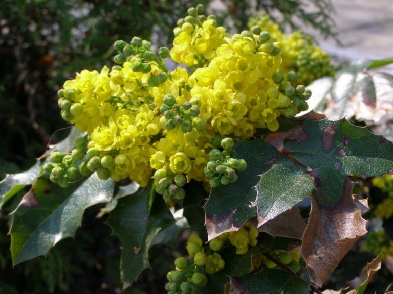 Oprócz zimozielonych liści dodatkową ozdoba mahonii są żółte kwiaty pojawiające się w kwietniu i maju. Późnym latem i jesienią ozdobą są kuliste granatowe owoce.