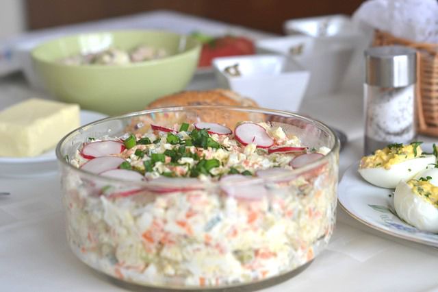 Tradycyjna, polska sałatka jarzynowa z jabłkiem towarzyszy prawie wszystkim uroczystościom. Nie może jej zabraknąć na Wigilii, rodzinnym przyjeciu czy imieninach. Również w święta Wielkiej Nocy ten tradycyjny przysmak musi pojawić się na stole. Swój tradycyjny smak zawdzięcza połaczeniu ugotowanych ziemników, marchewki i pietruszki, a lekko kwaśne jabłka, kiszone ogórki i seler nadają jej wyrazistego smaku.