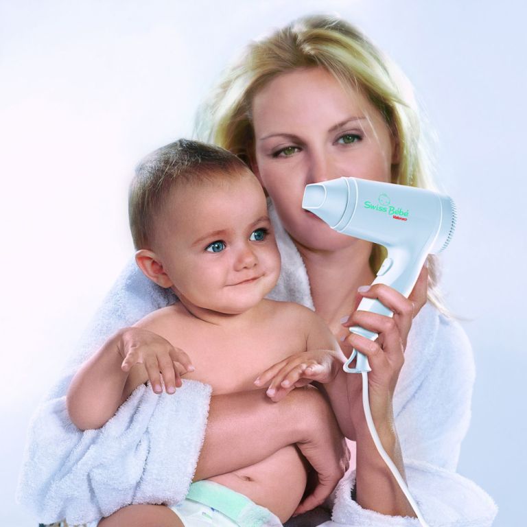 Cechą charakterystyczną suszarki Swiss Bébé jest również niezwykle lekki i delikatny strumień powietrza, który wynosi ok 10 l/s. Siła nadmuchu jest blisko o połowę mniejsza, niż w standardowych urządzeniach. Dzięki temu suszarka jest bezpieczna dla wrażliwej skóry głowy dziecka, ale również przyjazna w użytkowaniu.