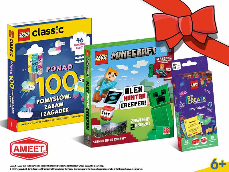 Z tym pakietem 3 wyjątkowych zestawów Twoje dziecko będzie mogło puścić wodze fantazji i uwolnić całkiem nowe pokłady kreatywności. LEGO® Minecraft®. Alex kontra Creeper! zachwyci każdego fana świata Minecraft®, w którym aż roi się od niesamowitych mobów. Oprócz minifigurki Alex oraz modeli Creepera i TNT w zestawie znajdują się książka z zadaniami i komiksem, przewodnik ze wskazówkami do budowania, a także papierowa dwustronna scenka 3D do zabawy. Z zestawem LEGO® Classic. Ponad 100 pomysłów, zabaw i wyzwań nie ma czasu na nudę. W książce czeka mnóstwo konstrukcyjnych zadań i wyzwań, a każde z nich zostało zaprojektowane tak, żeby zajęło najwyżej pięć minut. Dzięki 46 wyselekcjonowanym klockom LEGO®, wśród których znajdują się też klocki przezroczyste, mogą powstać niesamowite budowle i stworki. Dodatkową atrakcją jest też pudełko, które stanowi scenkę do zabawy. Serii LEGO® Recreate. Karty Wyzwań nie trzeba nikomu przedstawiać – w konkursowym pakiecie znajdziemy zestaw do tworzenia niesamowitych klockowych wynalazków. Dziecko będzie mogło wybudować wehikuł czasu, robokelnera, noktowizor, kosmiczny śmigacz, a nawet plecak odrzutowy. To potężna dawka fantastycznej rozrywki!